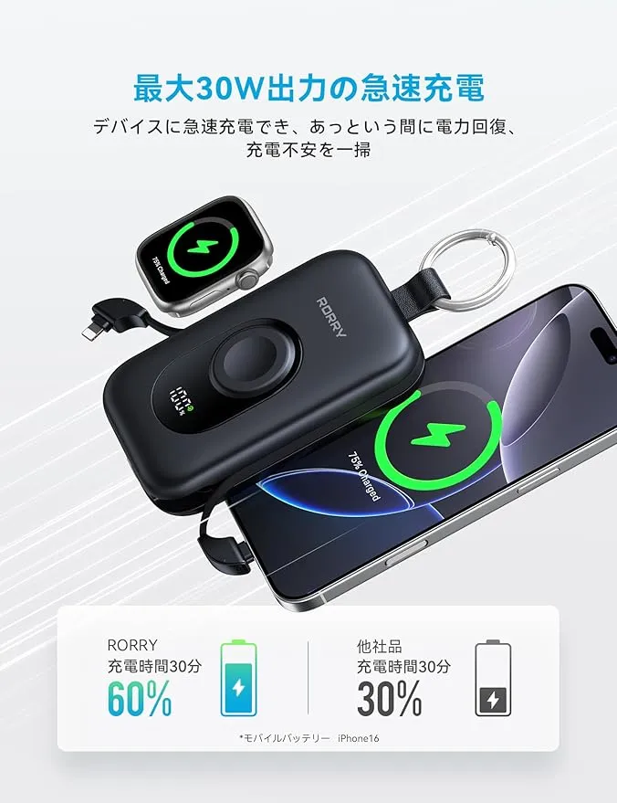 #RORRY #モバイルバッテリー #20000mAh #PD30W #ケーブル内蔵 #同時充電 #AppleWatch充電 #iPhoneアクセサリー #防災グッズ #ガジェット