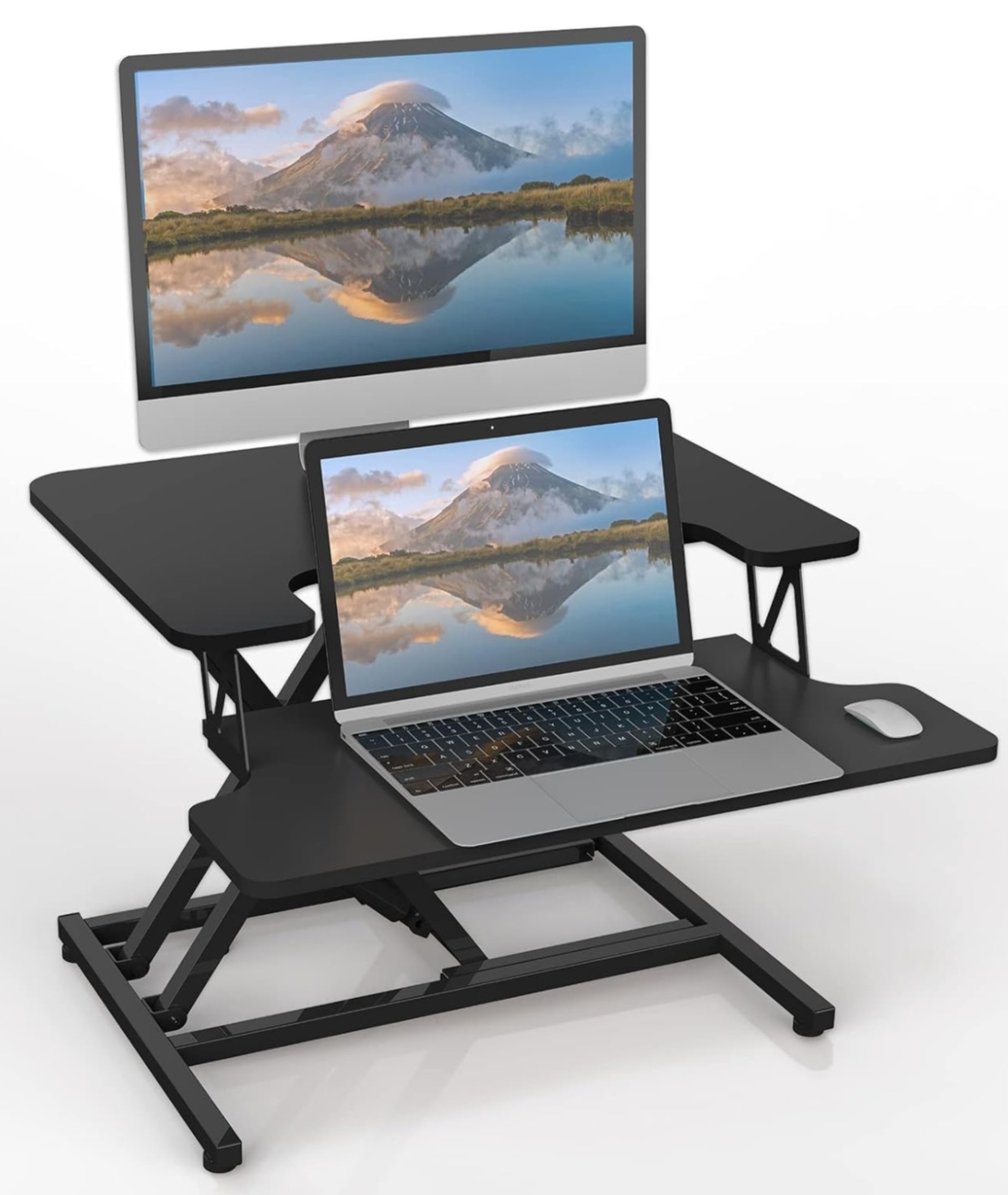 「ERGOMAKER スタンディングデスク 卓上」の最大の魅力は、無段階で高さ調節が可能なことです。ガス圧昇降式なので、デスクをスムーズに調整でき、座ったり立ったりの切り替えがとても簡単に行えます。私のデスクの高さは、13cmから39cmまで調整でき、立った状態でも快適に作業できます。特に、キーボード台もついているため、長時間の作業でも肩や腕に負担がかかりにくいです。