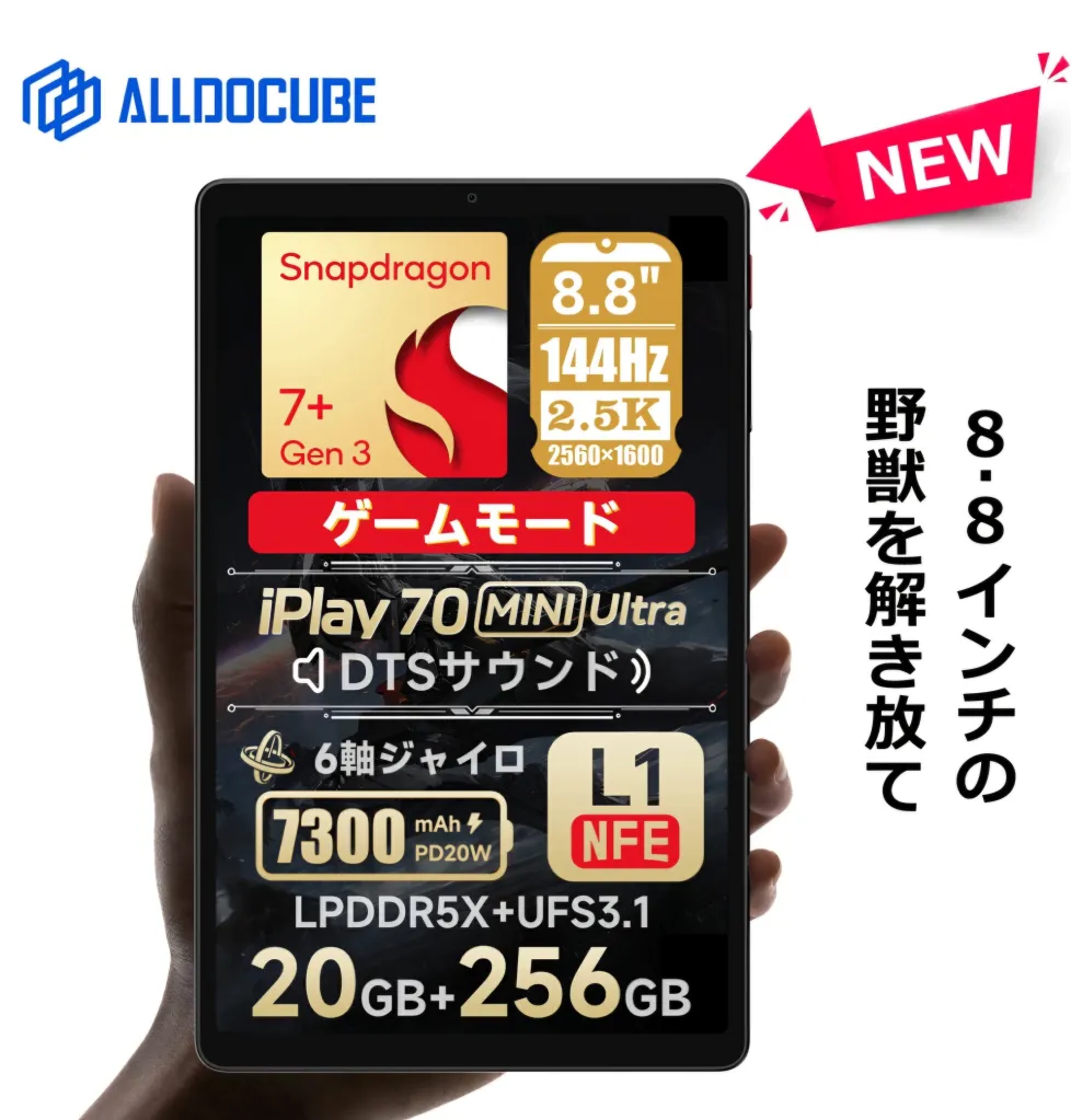 「ALLDOCUBE iPlay 70 mini Ultra」は、Snapdragon 7+ Gen3を搭載し、8.8インチの高解像度ディスプレイ&144Hzリフレッシュレートを誇るAndroidタブレットです。高速メモリ&ストレージにより、ゲーム・動画・電子書籍・マルチタスクも快適にこなせるハイスペックモデル!