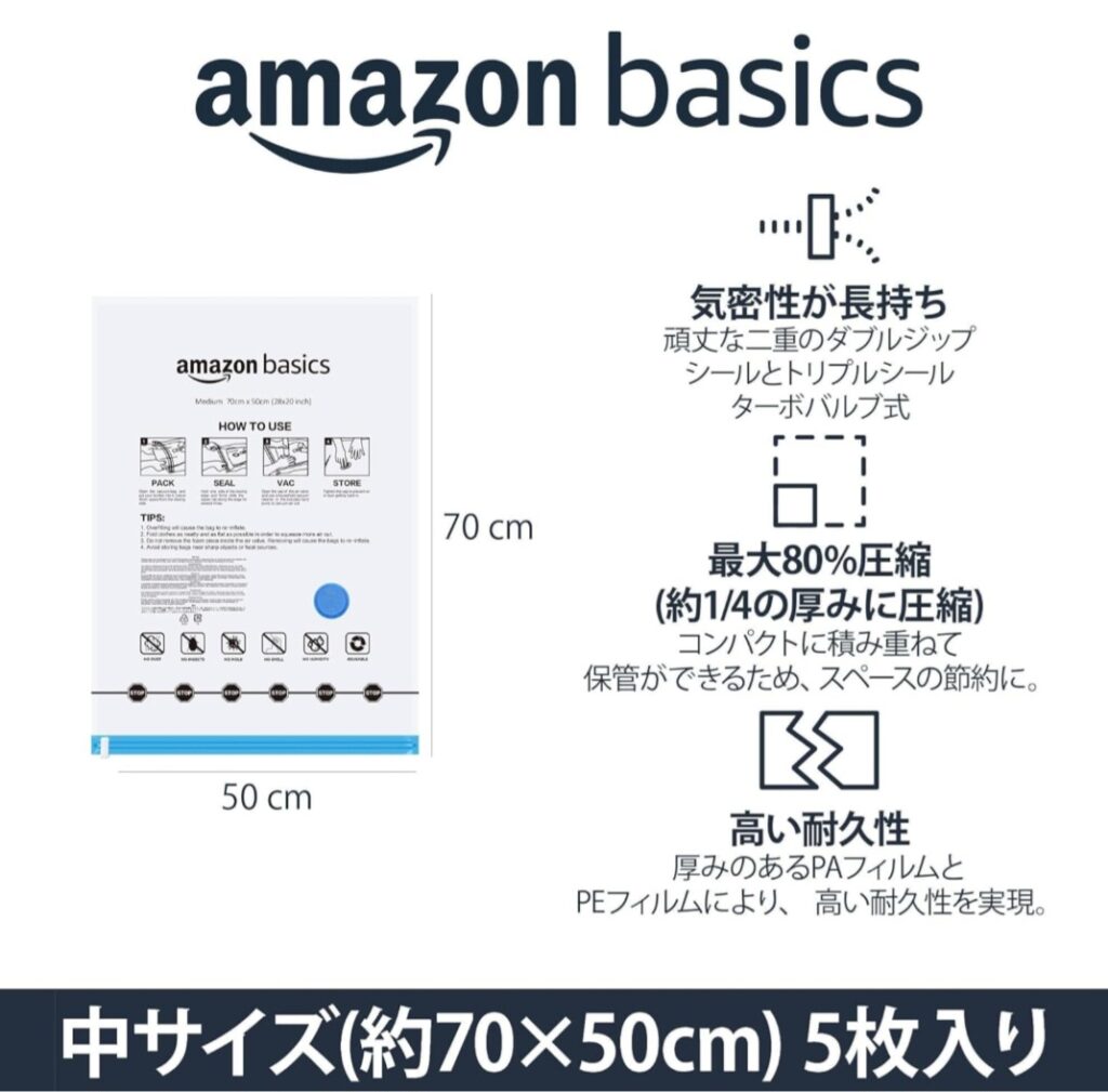 Amazonベーシックの真空衣類圧縮袋は、派手なアイテムではありませんが、使うと便利さをすぐ実感しやすいタイプです。