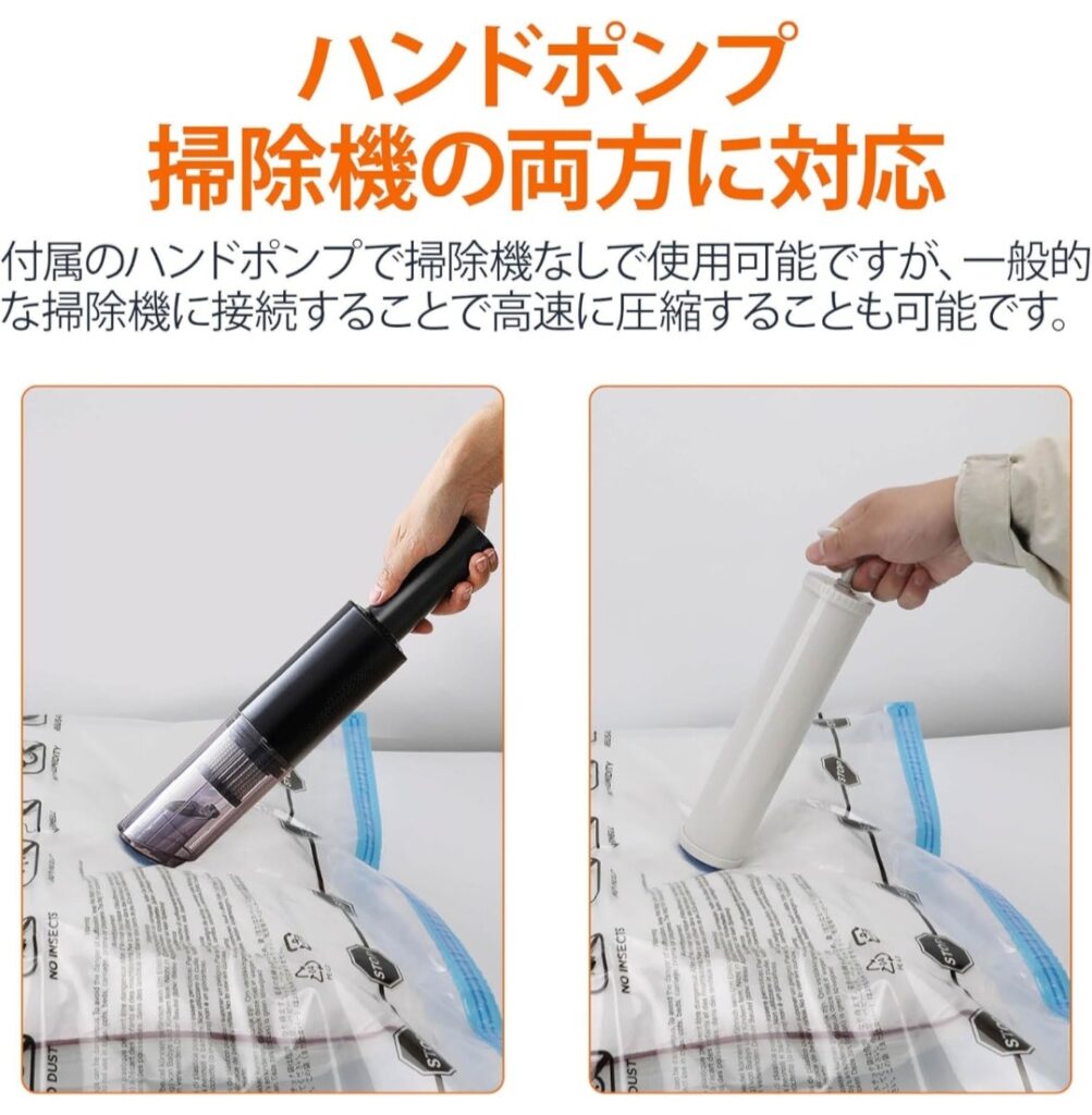 収納グッズは準備が面倒だと使わなくなりがちですが、これはハンドポンプ付きなので気軽に使いやすいです。