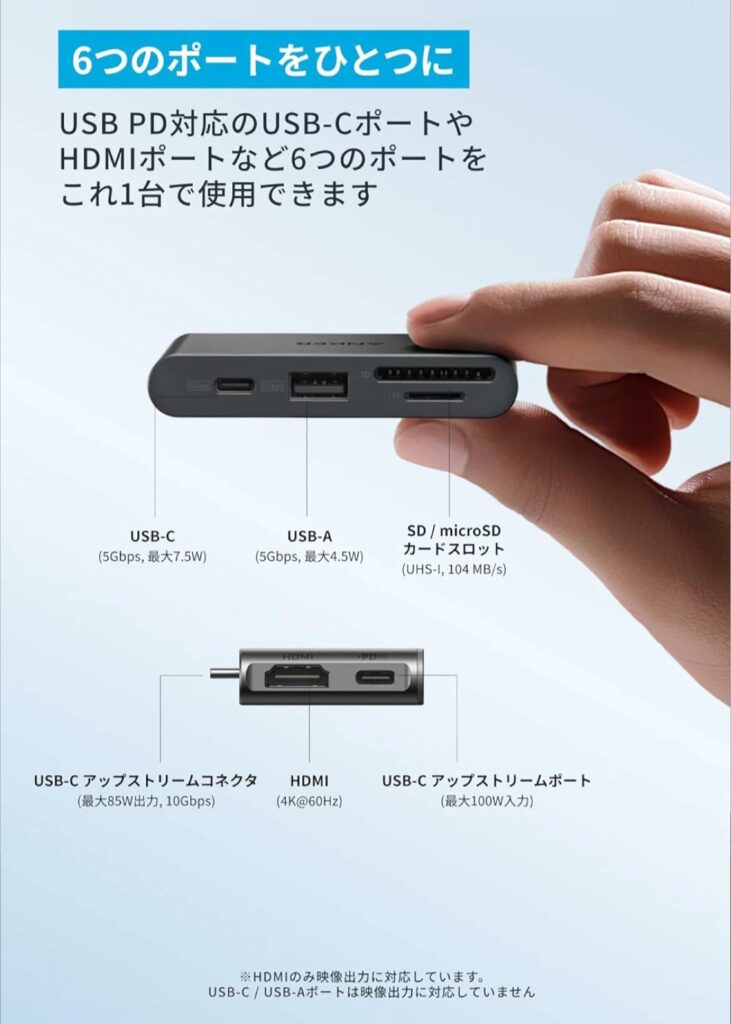 そこで便利なのが、Anker Nano USB-C ハブ (6-in-1, 5Gbps)。 コンパクトなのに、映像出力・データ転送・カード読み込み・パススルー充電までまとめてこなせる、かなり実用的なUSB-Cハブです。