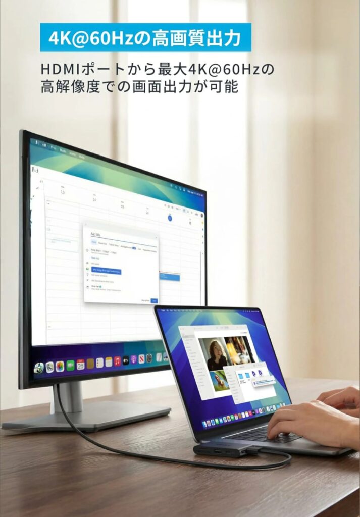 こういう場面で、毎回アダプターを分けて持つ必要がなくなるのはかなりラクです。 特にノートPCを持ち歩く人ほど、こうした“1個で済む”便利さを実感しやすいと思います。
