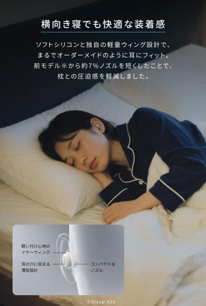 普通のイヤホンを“寝るときにも使えるようにした”のではなく、最初から睡眠シーンを前提にしているのが、この製品の大きなポイントです。