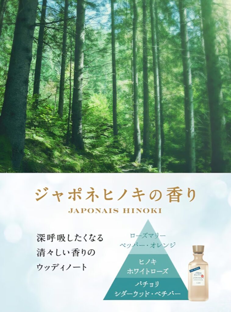 柑橘系のようなスッキリ感とも、甘いフローラル系とも違って、ヒノキは“落ち着く方向”に気分を持っていきやすいです。 1日の終わりに気持ちを切り替えたいとき、この香りはかなり相性がいいと感じやすいです。